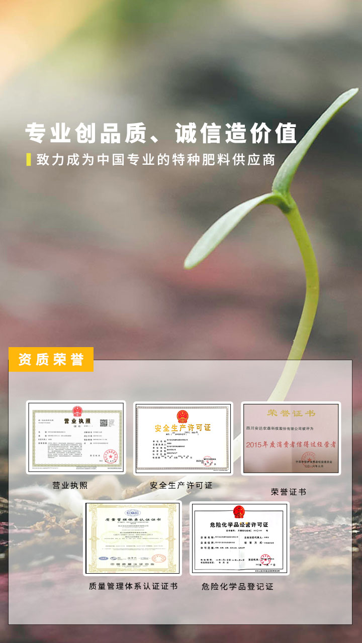 經(jīng)過二十余年的探索和實踐,依托自身技術(shù)和出口背景,按照國際市場規(guī)范培養(yǎng)了大批高素質(zhì)的專業(yè)化技術(shù)化團(tuán)隊,掌握了水溶性肥料的核心技術(shù),擁有完善的研發(fā)中心、質(zhì)檢中心,目前已獲得多個國家專利技術(shù)。公司一直把“做中國專業(yè)的特種肥料供應(yīng)商”作為自身的發(fā)展使命。推廣高端植物營養(yǎng)與先進(jìn)技術(shù),高效施肥方式的綜合配套方案,減輕中國種植業(yè)勞動強度,讓種植業(yè)效率更高、效果更強、效益更好!努力成為革新中國種植業(yè)生產(chǎn)方式的偉大公司!